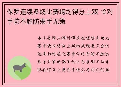 本文将深入探讨保罗在连续多场比赛中场均得分上双的表现,重点分析他是如何在比赛中令对手防不胜防,束手无策的。保罗的出色表现不仅体现在得分上,更在于他无与伦比的篮球智慧与技术。在接下来的内容中,我们将从以下四个方面进行详细阐述:一是保罗的得分能...