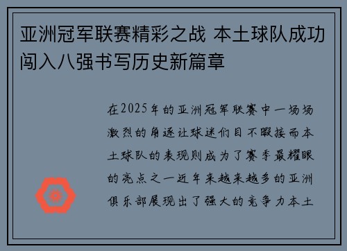 亚洲冠军联赛精彩之战 本土球队成功闯入八强书写历史新篇章