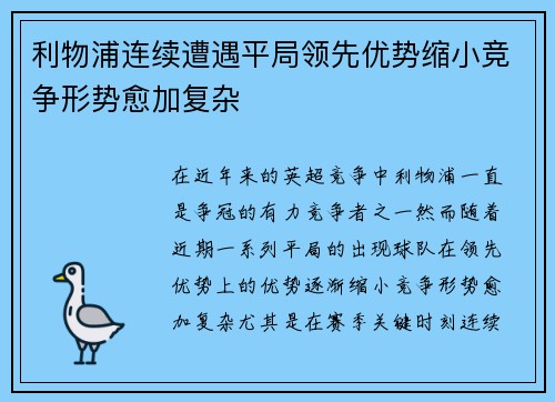 利物浦连续遭遇平局领先优势缩小竞争形势愈加复杂
