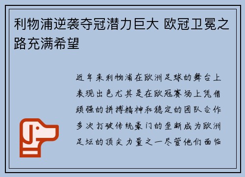 利物浦逆袭夺冠潜力巨大 欧冠卫冕之路充满希望