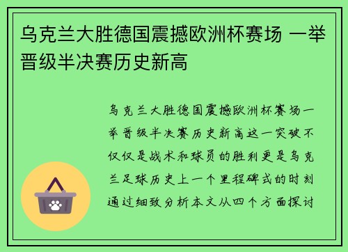 乌克兰大胜德国震撼欧洲杯赛场,一举晋级半决赛历史新高。这一突破不仅仅是战术和球员的胜利,更是乌克兰足球历史上一个里程碑式的时刻。通过细致分析,本文从四个方面探讨乌克兰如何在这场关键比赛中击败德国,晋级欧洲杯半决赛,创造历史新高。首先,文章回...