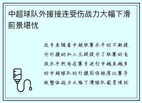 中超球队外援接连受伤战力大幅下滑前景堪忧
