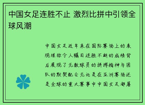 中国女足近年来在国际赛场上的表现堪称令人瞩目,连胜不断的成绩背后展现了无数球员的拼搏精神与团队的默契配合。无论是在亚洲赛场还是全球的重大赛事中,中国女足都屡屡逆袭强敌,证明了自己在世界女足中的重要地位。这篇文章将从四个方面深入分析中国女足如...