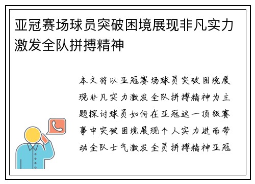 本文将以“亚冠赛场球员突破困境展现非凡实力,激发全队拼搏精神”为主题,探讨球员如何在亚冠这一顶级赛事中突破困境、展现个人实力,进而带动全队士气,激发全员拼搏精神。亚冠作为亚洲足球的顶级赛事,不仅是球员展示自我的舞台,更是各支球队为了亚洲荣誉...