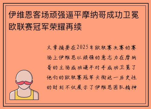 伊维恩客场顽强逼平摩纳哥成功卫冕欧联赛冠军荣耀再续