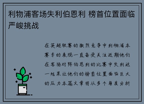 利物浦客场失利伯恩利 榜首位置面临严峻挑战
