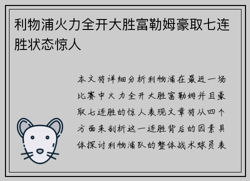 本文将详细分析利物浦在最近一场比赛中火力全开,大胜富勒姆,并且豪取七连胜的惊人表现。文章将从四个方面来剖析这一连胜背后的因素,具体探讨利物浦队的整体战术、球员表现、教练的战术调整以及对未来比赛的影响。每个方面都将有深入的阐述,从多个角度为读...