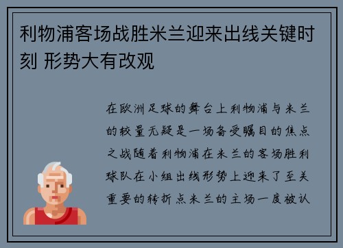 利物浦客场战胜米兰迎来出线关键时刻 形势大有改观