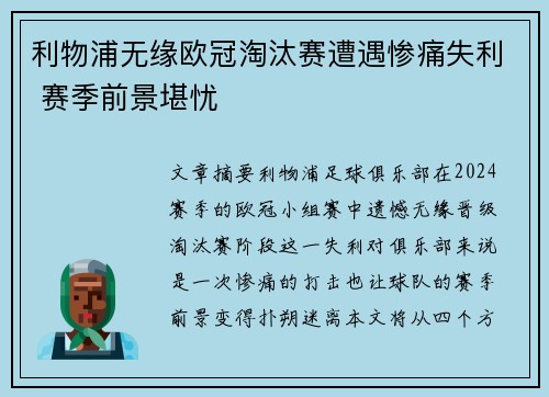 利物浦无缘欧冠淘汰赛遭遇惨痛失利 赛季前景堪忧