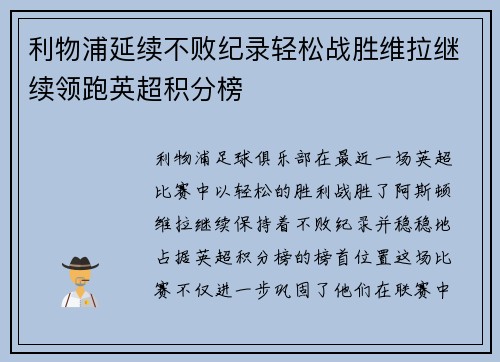 利物浦延续不败纪录轻松战胜维拉继续领跑英超积分榜
