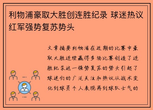 利物浦豪取大胜创连胜纪录 球迷热议红军强势复苏势头