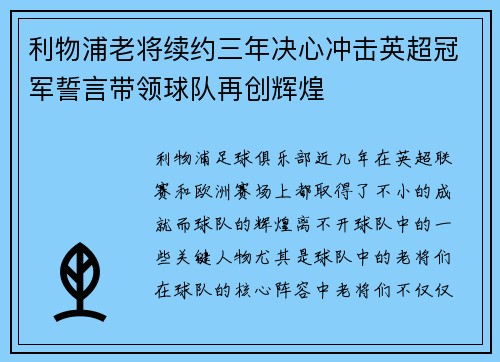 利物浦老将续约三年决心冲击英超冠军誓言带领球队再创辉煌