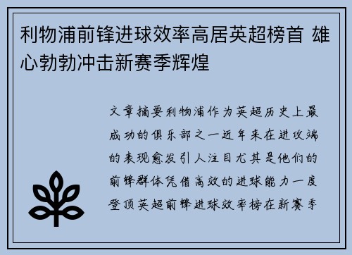 利物浦前锋进球效率高居英超榜首 雄心勃勃冲击新赛季辉煌