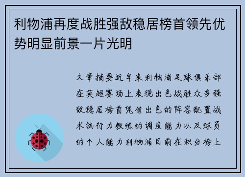 利物浦再度战胜强敌稳居榜首领先优势明显前景一片光明
