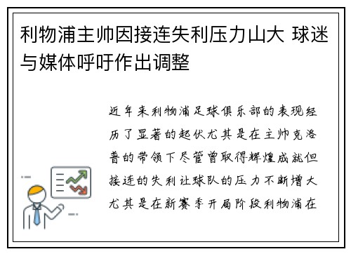 利物浦主帅因接连失利压力山大 球迷与媒体呼吁作出调整