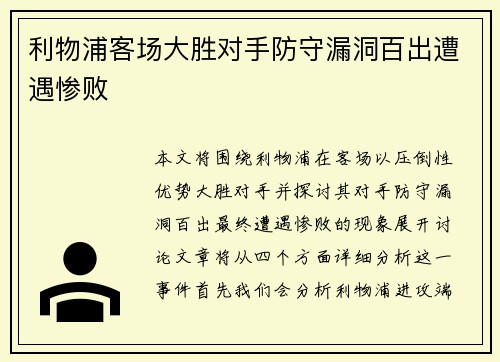 本文将围绕利物浦在客场以压倒性优势大胜对手,并探讨其对手防守漏洞百出,最终遭遇惨败的现象展开讨论。文章将从四个方面详细分析这一事件。首先,我们会分析利物浦进攻端的火力展现如何摧毁对方防线,帮助球队取得大胜。其次,我们将探讨对方防守漏洞的具体...