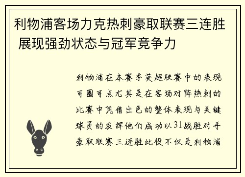 利物浦客场力克热刺豪取联赛三连胜 展现强劲状态与冠军竞争力