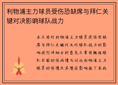 利物浦主力球员受伤恐缺席与拜仁关键对决影响球队战力