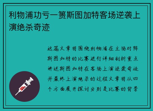 这篇文章将围绕利物浦在主场对阵斯图加特的比赛进行详细剖析,重点讲述斯图加特在客场上演逆袭奇迹并最终上演绝杀的过程。文章将从四个方面展开探讨,分别是:比赛的背景与两队状态分析、利物浦的战术部署与意外失误、斯图加特的顽强反击与逆袭过程,以及最后...