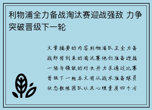 文章摘要的内容:利物浦队正全力备战即将到来的淘汰赛,他们准备迎接一场与强敌的对决,并力求通过比赛,晋级下一轮。本文将从战术准备、球员状态、教练团队以及心理素质四个方面详细阐述利物浦队的备战情况。1、战术准备在备战淘汰赛阶段,利物浦队的战术准...