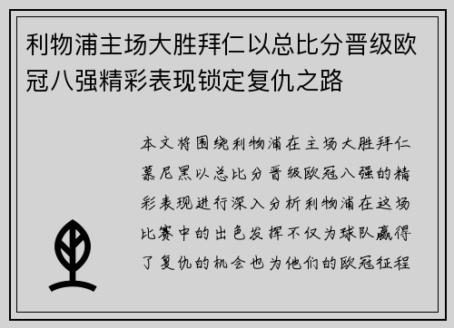 利物浦主场大胜拜仁以总比分晋级欧冠八强精彩表现锁定复仇之路