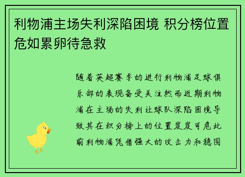 利物浦主场失利深陷困境 积分榜位置危如累卵待急救