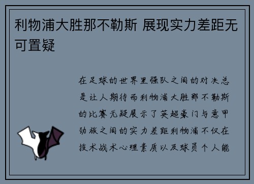 在足球的世界里,强队之间的对决总是让人期待,而利物浦大胜那不勒斯的比赛,无疑展示了英超豪门与意甲劲旅之间的实力差距。利物浦不仅在技术、战术、心理素质以及球员个人能力上占据压倒性优势,更凭借团队的默契与高效的攻防体系,展现了无与伦比的统治力。...