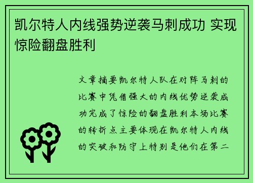 凯尔特人内线强势逆袭马刺成功 实现惊险翻盘胜利