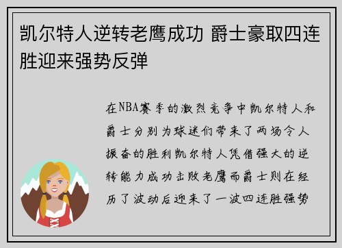凯尔特人逆转老鹰成功 爵士豪取四连胜迎来强势反弹