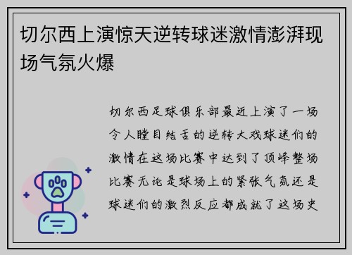 切尔西上演惊天逆转球迷激情澎湃现场气氛火爆