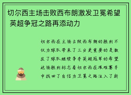 切尔西在主场击败西布朗的胜利不仅为球队带来了三分,更重要的是,激发了球队继续争夺英超冠军的希望。这场胜利标志着切尔西在艰难赛季中找回了自信,为卫冕之路注入了新的动力。随着赛季的推进,切尔西逐渐展现出强大的竞技状态和团队配合,尤其是在面对弱旅...