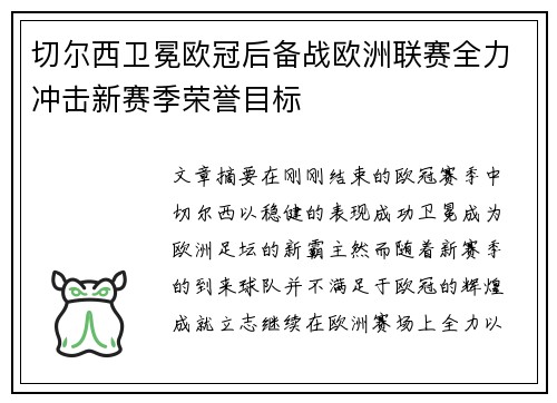 文章摘要:在刚刚结束的欧冠赛季中,切尔西以稳健的表现成功卫冕,成为欧洲足坛的新霸主。然而,随着新赛季的到来,球队并不满足于欧冠的辉煌成就,立志继续在欧洲赛场上全力以赴,尤其是在欧洲联赛和其他各项荣誉的争夺中。本文将围绕切尔西卫冕欧冠后,如何...