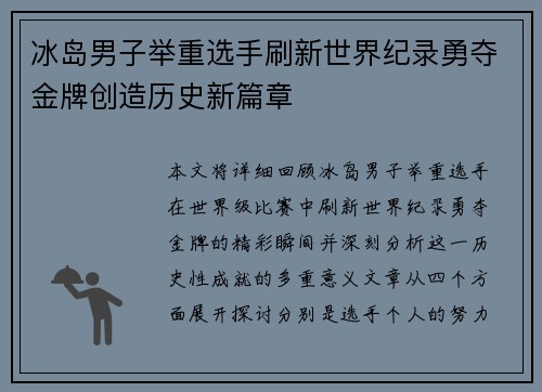 冰岛男子举重选手刷新世界纪录勇夺金牌创造历史新篇章