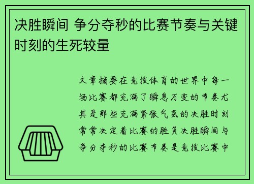 决胜瞬间 争分夺秒的比赛节奏与关键时刻的生死较量