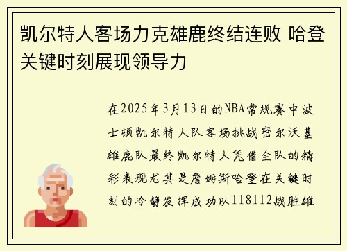 凯尔特人客场力克雄鹿终结连败 哈登关键时刻展现领导力