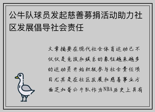 公牛队球员发起慈善募捐活动助力社区发展倡导社会责任