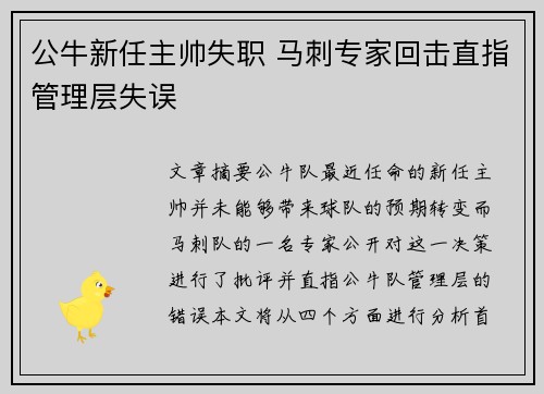 公牛新任主帅失职 马刺专家回击直指管理层失误