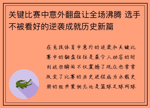 关键比赛中意外翻盘让全场沸腾 选手不被看好的逆袭成就历史新篇