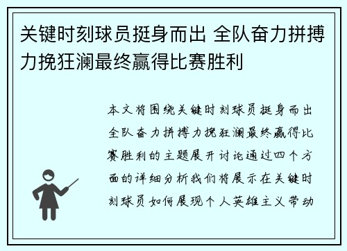 本文将围绕“关键时刻球员挺身而出,全队奋力拼搏力挽狂澜,最终赢得比赛胜利”的主题展开讨论。通过四个方面的详细分析,我们将展示在关键时刻球员如何展现个人英雄主义,带动全队奋起反击,最终取得了比赛的胜利。首先,我们将探讨关键时刻球员的决策和行动...