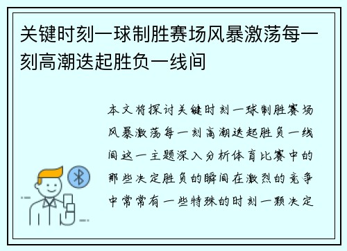 关键时刻一球制胜赛场风暴激荡每一刻高潮迭起胜负一线间