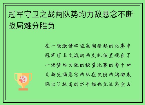 冠军守卫之战两队势均力敌悬念不断战局难分胜负