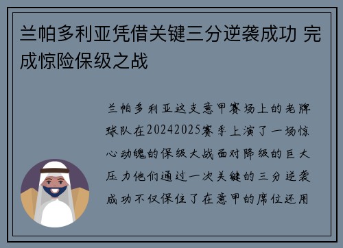 兰帕多利亚凭借关键三分逆袭成功 完成惊险保级之战