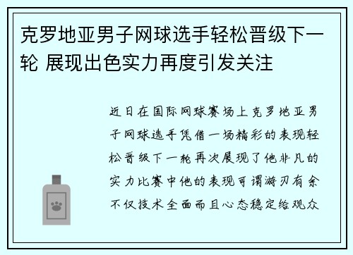 克罗地亚男子网球选手轻松晋级下一轮 展现出色实力再度引发关注