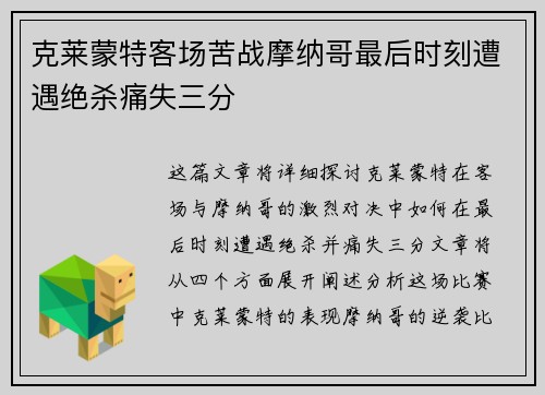 这篇文章将详细探讨克莱蒙特在客场与摩纳哥的激烈对决中,如何在最后时刻遭遇绝杀并痛失三分。文章将从四个方面展开阐述,分析这场比赛中克莱蒙特的表现、摩纳哥的逆袭、比赛中出现的关键时刻以及克莱蒙特痛失三分的具体原因。每个方面将分别从球队战术、关键...