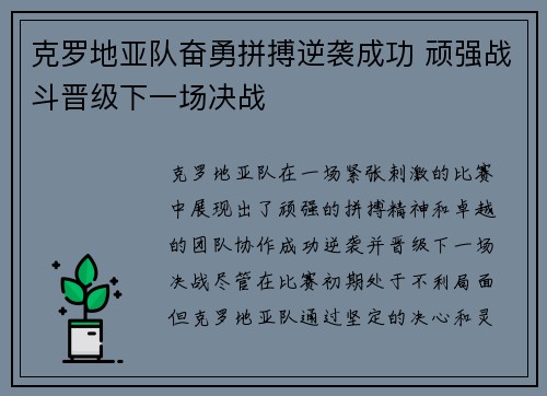 克罗地亚队在一场紧张刺激的比赛中,展现出了顽强的拼搏精神和卓越的团队协作,成功逆袭并晋级下一场决战。尽管在比赛初期处于不利局面,但克罗地亚队通过坚定的决心和灵活的战术调整,最终扭转了局势。本文将从四个方面对克罗地亚队如何奋勇拼搏、逆袭成功并...