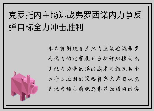 克罗托内主场迎战弗罗西诺内力争反弹目标全力冲击胜利