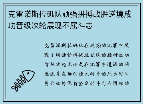 克雷诺斯拉矶队顽强拼搏战胜逆境成功晋级次轮展现不屈斗志