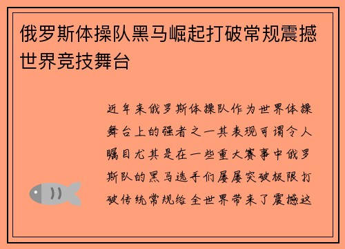 俄罗斯体操队黑马崛起打破常规震撼世界竞技舞台