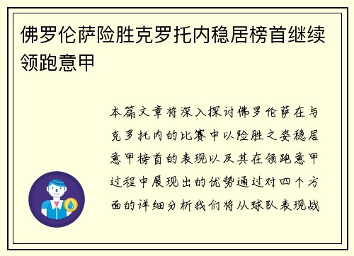 本篇文章将深入探讨佛罗伦萨在与克罗托内的比赛中以险胜之姿稳居意甲榜首的表现,以及其在领跑意甲过程中展现出的优势。通过对四个方面的详细分析,我们将从球队表现、战术部署、球员发挥以及意甲竞争格局等多个角度,全面解析佛罗伦萨如何通过这场胜利延续领...