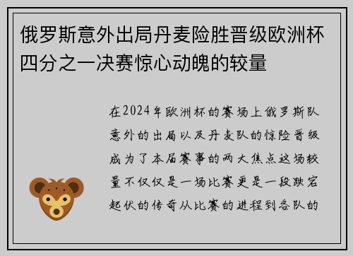 俄罗斯意外出局丹麦险胜晋级欧洲杯四分之一决赛惊心动魄的较量